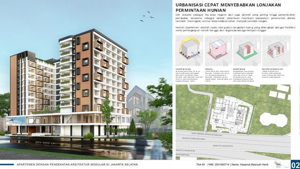 arsitektur modular dan dengan menggunakan metode prefabrikasi guna mengoptimalkan waktu konstruksi, menekan biaya Pembangunan dengan material yang digunakan, untuk menghadapi pertumbuhan penduduk dan keterbatasan lahan di Jakarta Selatan mendorong kebutuhan hunian yang efisien bagi masyarakat kelas menengah. Melalui pendekatan arsitektur modular ini, memanfaatkan panel panel standar modul yang di produksi diluar lokasi dan dirakit di tapak menjadi solusi bagi permasalahan Jakarta Selatan.