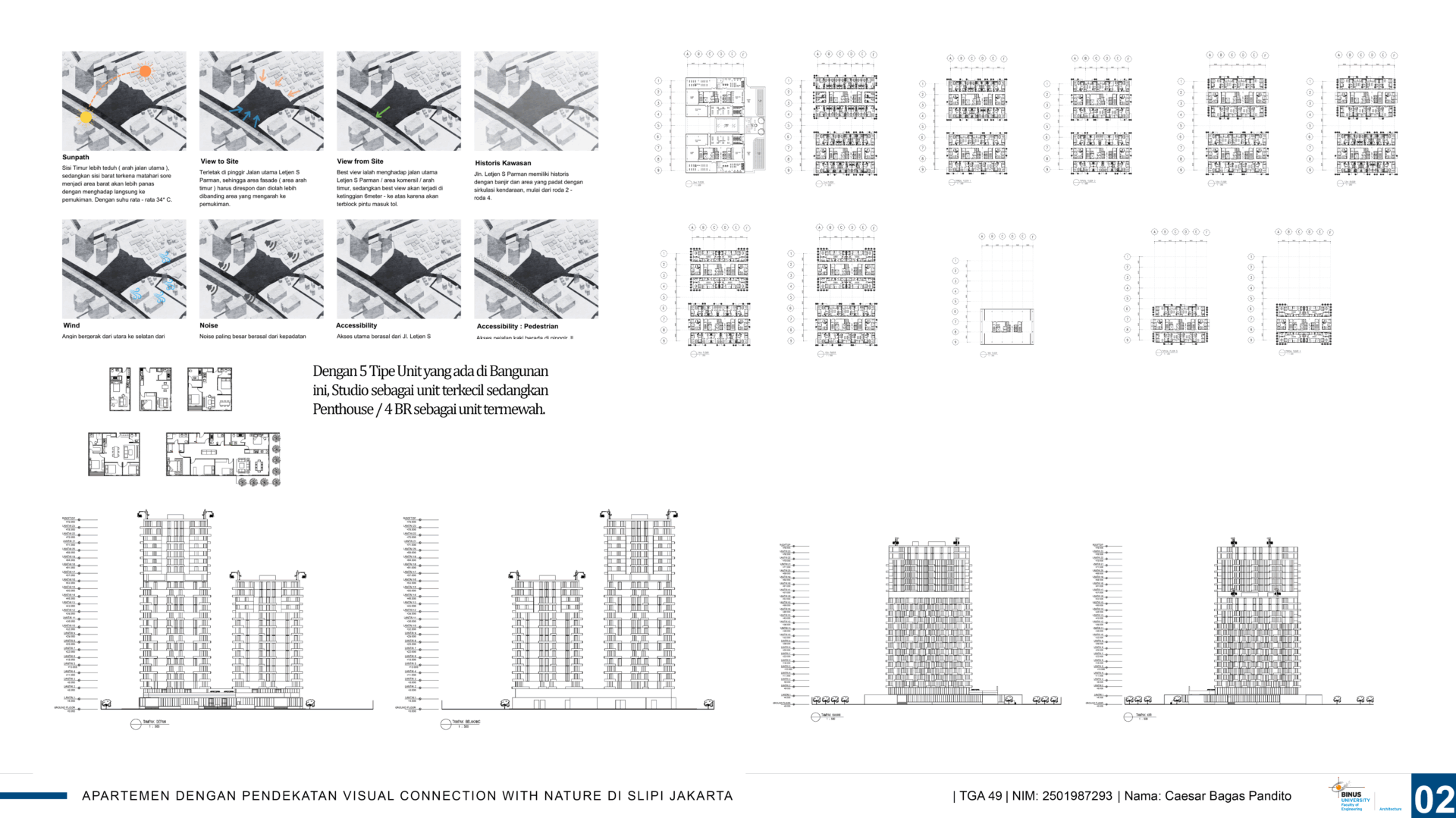 DescriptionSlipi, Jakarta Barat adalah kawasan urban dengan kepadatan tinggi dan akses terbatas terhadap elemen alami. Proyek apartemen ini merespons kondisi tersebut dengan menghadirkan green balcony sebagai strategi utama dari pendekatan Visual Connection With Nature. Balkon hijau dirancang sebagai perpanjangan dari ruang tinggal, memungkinkan penghuni untuk terhubung secara visual dengan tanaman dan kehijauan dari dalam unit mereka. Kehadiran elemen alami ini menciptakan suasana yang lebih tenang dan mendukung kesejahteraan psikologis. Pendekatan ini menegaskan bahwa satu elemen arsitektural yang dirancang secara tepat dapat membawa dampak signifikan terhadap kualitas hidup, bahkan di tengah lingkungan perkotaan yang padat dan terbatas ruang hijaunya.