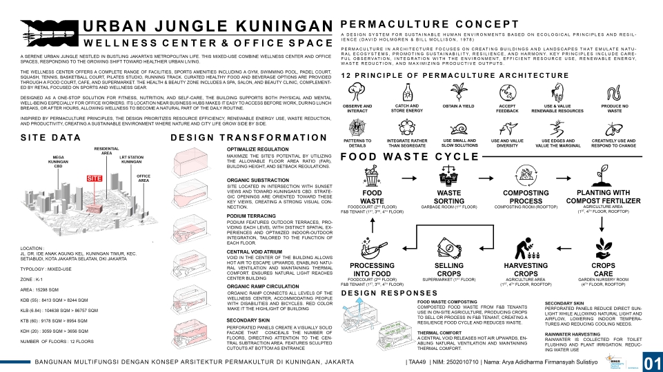 DescriptionSebagai respons terhadap meningkatnya kesadaran akan pentingnya kesehatan fisik dan mental di kalangan pekerja urban Jakarta, proyek ini mengusulkan sebuah bangunan multifungsi berkelanjutan yang terletak di kawasan strategis Mega Kuningan. Bangunan ini menggabungkan fasilitas kantor modern dengan pusat kebugaran yang lengkap dan mudah diakses. Menjawab tantangan terbatasnya waktu serta kurangnya akses terhadap aktivitas fisik yang memadai, desain ini menerapkan prinsip Arsitektur Permakultur secara holistik guna meningkatkan kesejahteraan individu sekaligus mengurangi jejak ekologis. Terletak di zona campuran yang padat dan berpenghasilan tinggi, bangunan ini mengintegrasikan energi terbarukan, sistem pengolahan limbah, dan strategi desain berbasis alam, menawarkan model ruang kerja sehat, produktif, dan berkelanjutan di tengah kota Jakarta.