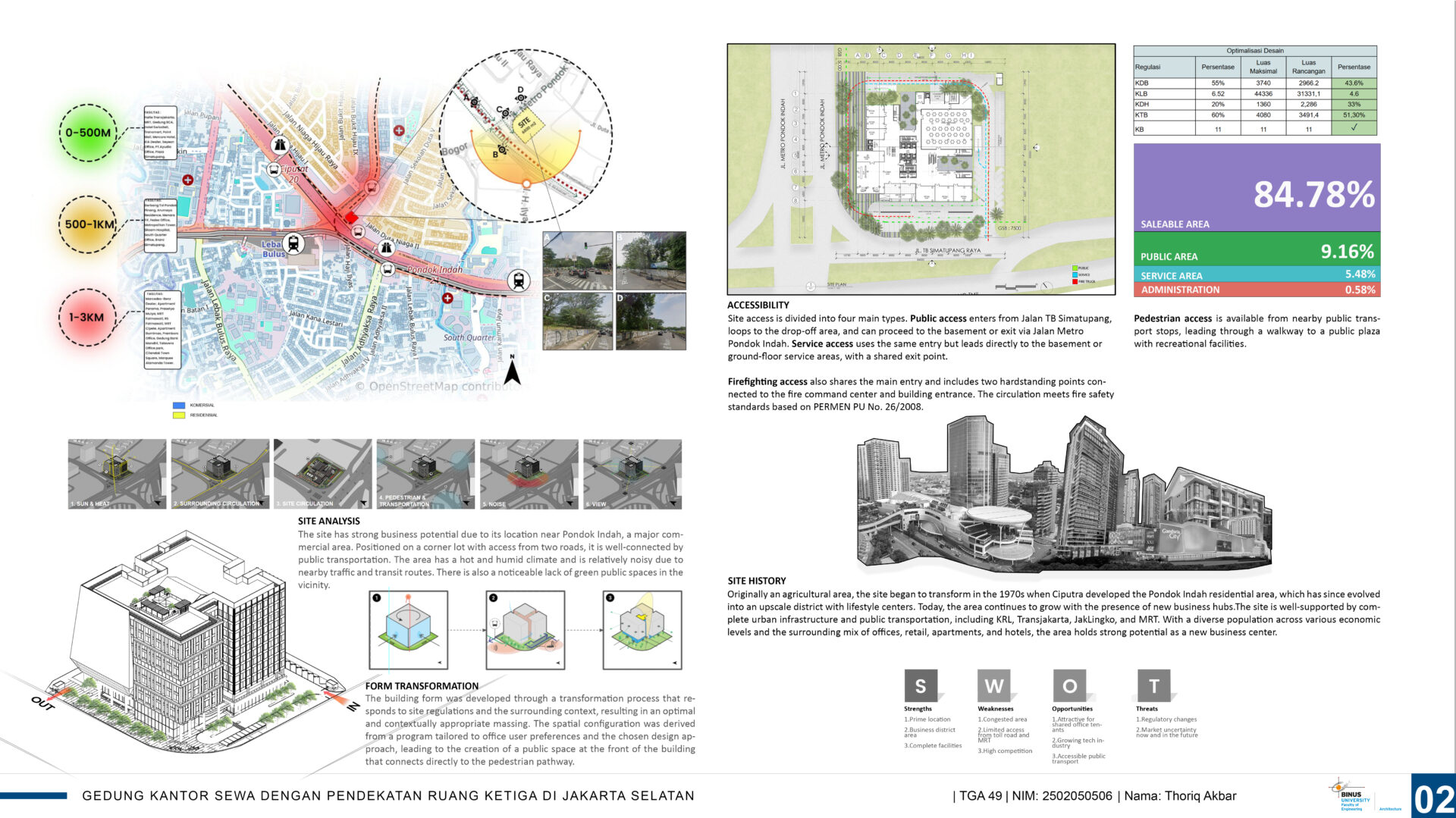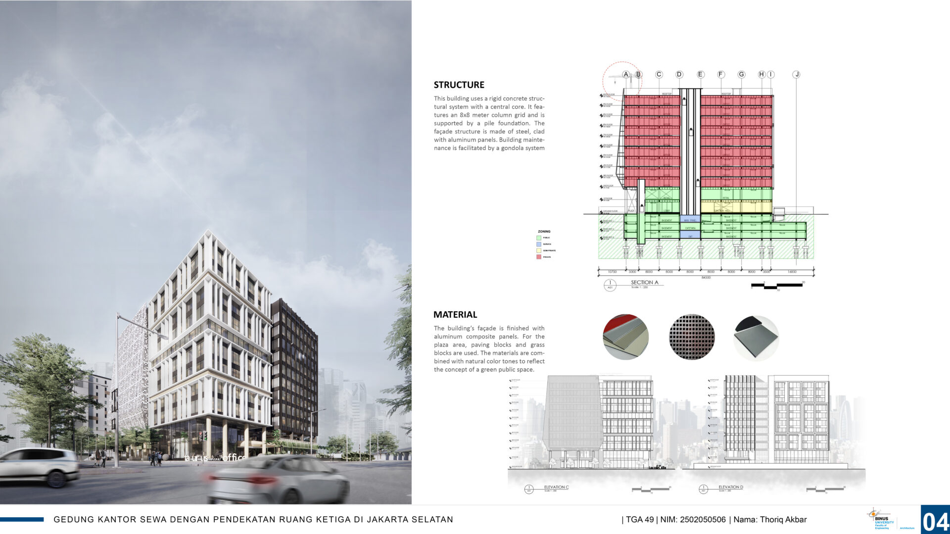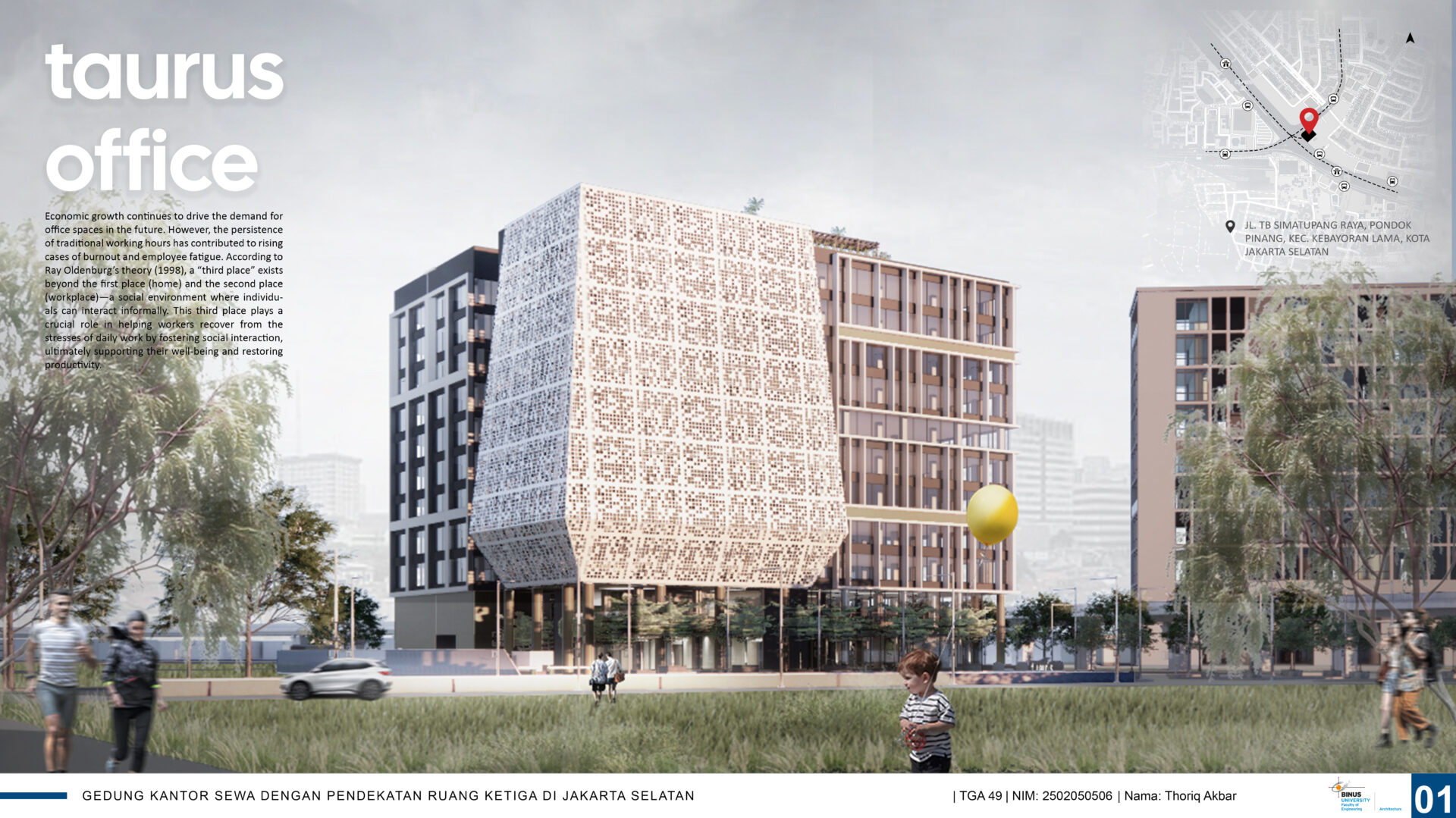 DescriptionPertumbuhan penduduk Jakarta mendorong peningkatan aktivitas kerja, namun sistem kerja konvensional sering menyebabkan kelelahan (burnout) pada karyawan. Interaksi sosial terbukti mampu meningkatkan produktivitas, sehingga perancangan gedung kantor ini menekankan penerapan konsep ruang ketiga sebagai ruang sosial pendukung aktivitas kerja. Metode yang digunakan meliputi survei terhadap para pekerja, observasi ruang ketiga pada sejumlah kantor di Jakarta, serta studi literatur dan studi preseden. Hasil menunjukkan adanya kebutuhan tinggi dari pekerja terhadap ruang sosial di luar area kerja utama, terutama ruang yang bersifat outdoor, nyaman, dan menyenangkan. Berdasarkan temuan tersebut, perancangan ini merancang sebuah gedung kantor sewa yang mengintegrasikan elemen ruang ketiga dalam bentuk indoor, semi-outdoor, dan outdoor. Ketiga jenis ruang ini dirancang untuk mendukung interaksi sosial antarpengguna serta menciptakan keseimbangan antara aktivitas kerja dan relaksasi, sehingga meningkatkan kualitas lingkungan kerja secara keseluruhan. Bangunan ini dirancang sesuai dengan regulasi tapak dan konteks lingkungan sekitar. Selain itu bangunan ini dirancang menyesuaikan dengan karakter pengguna perkantoran di Jakarta selatan.