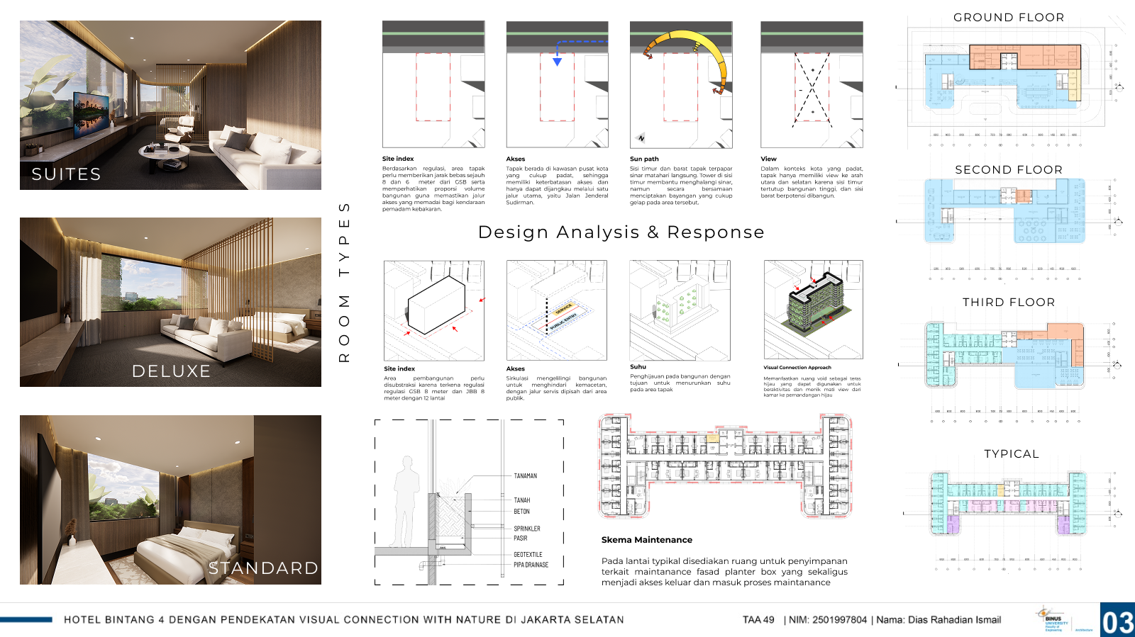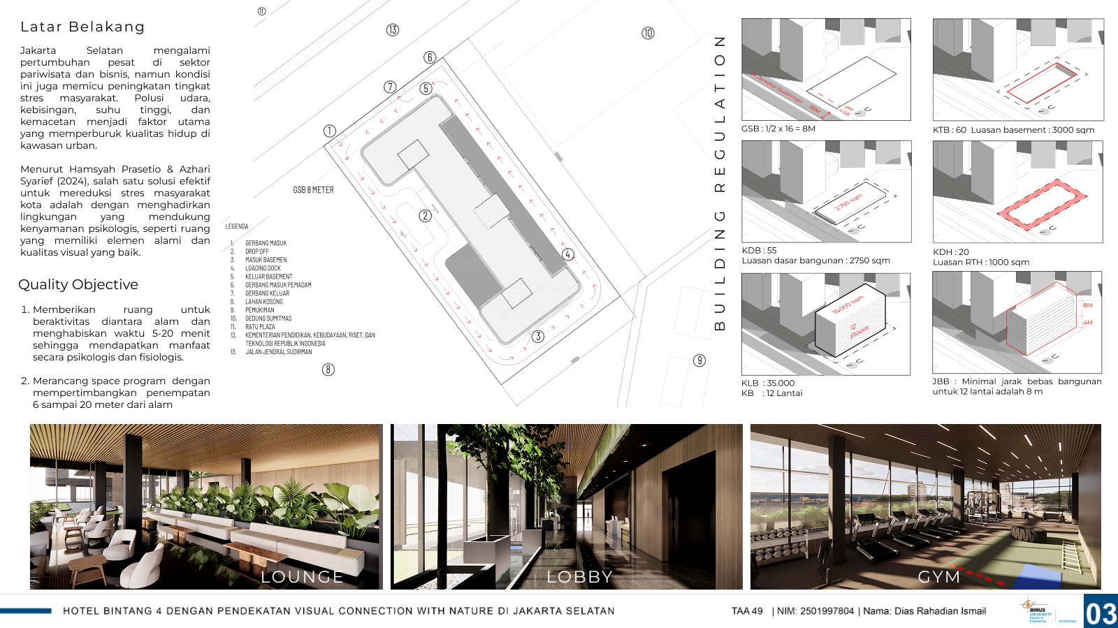 DescriptionPerkembangan kawasan urban di Jakarta Selatan telah mendorong peningkatan signifikan dalam kebutuhan akan fasilitas akomodasi yang tidak hanya memenuhi fungsi dasar, tetapi juga mampu memberikan kenyamanan, ketenangan, dan pengalaman ruang yang berkualitas tinggi bagi penggunanya. Salah satu pendekatan desain yang dianggap relevan untuk menjawab kebutuhan ini adalah visual connection with nature, yaitu menciptakan hubungan visual yang kuat antara ruang dengan elemen-elemen alam di sekitarnya, seperti pepohonan, taman, air, dan pencahayaan alami. Pendekatan ini diyakini dapat meningkatkan kualitas lingkungan binaan secara menyeluruh, memberikan dampak positif terhadap kesehatan mental, menurunkan tingkat stres, serta menciptakan suasana yang lebih rileks dan menyegarkan, terutama di tengah kepadatan dan tekanan hidup perkotaan.