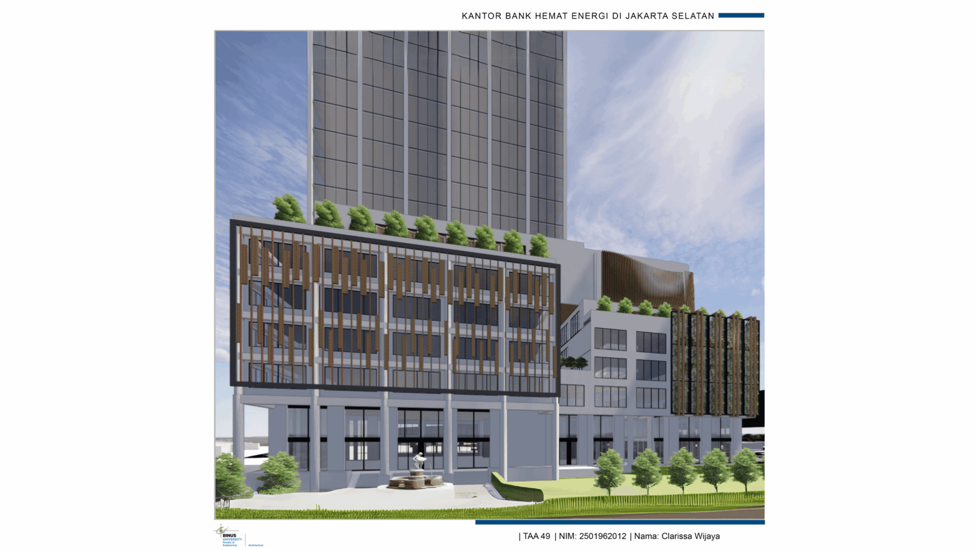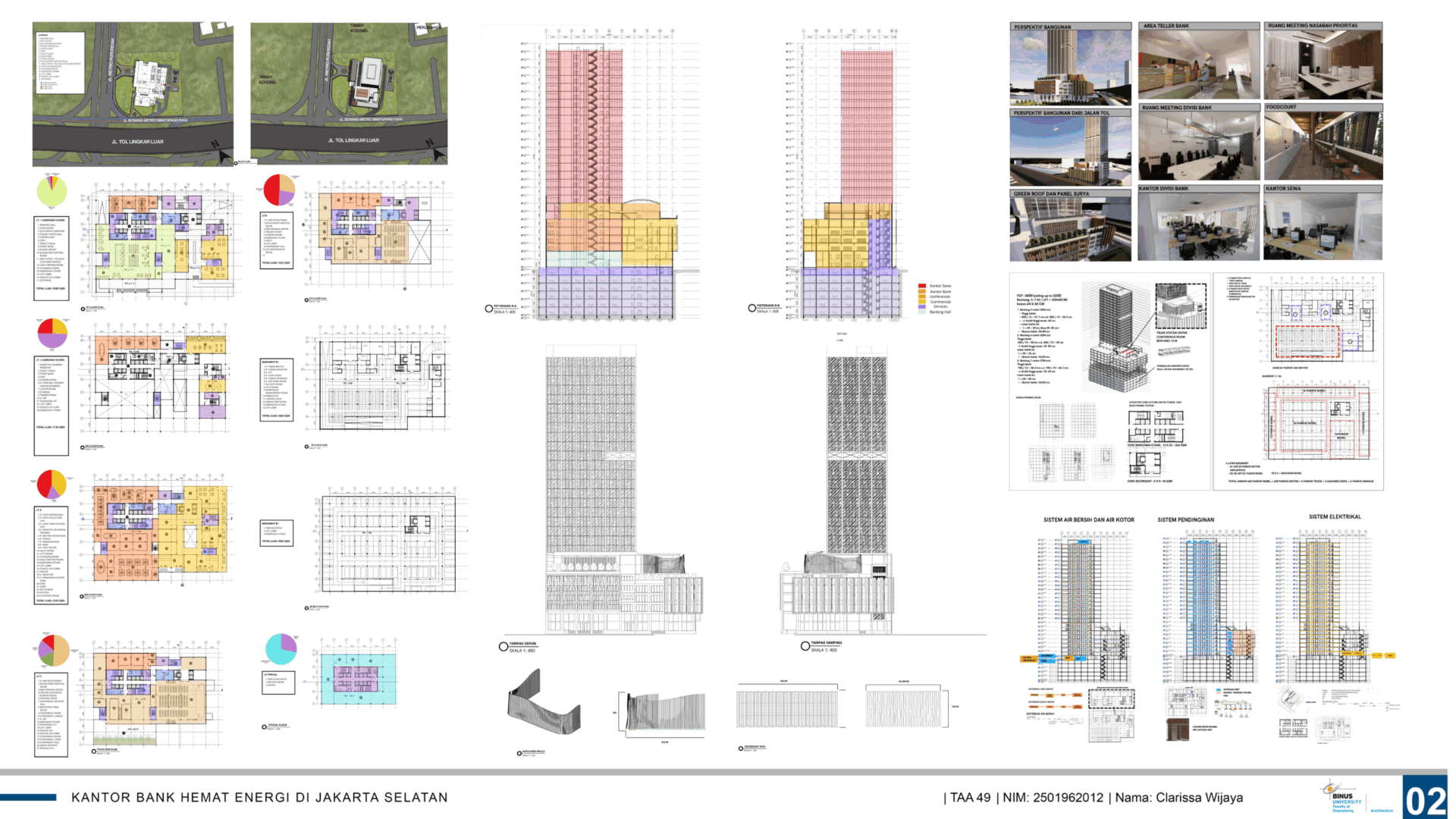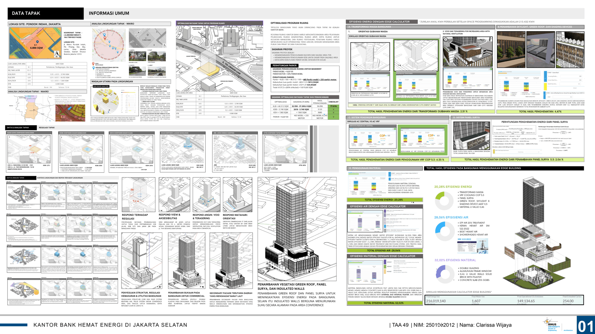 DescriptionPerancangan Kantor bank Hemat energi yang berlokasikan di Jl. Pondok Indah, Jakarta Selatan,. Tujuan perancangan adalah mendesain bangunan kantor bank hemat energi dengan menggunakan aplikasi calculator EDGE (Excellence in Design for Greater Efficiencies) building yang dikembangkan oleh International Finance Corporation (IFC). Bangunan dikatakan berhasil hemat energi menurut kalkulator edge bila mencapat 20% hemat energi. Untuk mencapai presentase tersebut, potensi dan permasalahan pada tapak dianalisa dan di evaluasi. Kemidan, berbagai strategi desain digunakan dan diukur menggunakan kalkulator edge seperti menggunakan panel surya, material hemat energi, dan peningkatan u-value pada bahan selubung bangunan. Permasalahan utama tapak adalah paparan sinar matahari yang tinggi, dan tingkat kepadatan kota seta kurangnya ruang hijau yang tinggi.