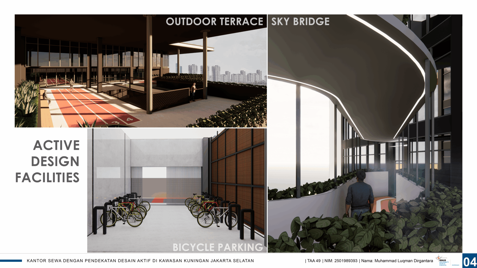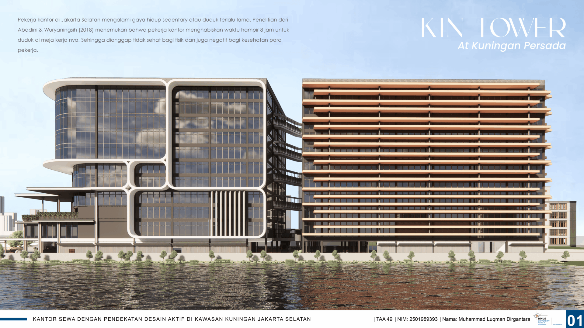 DescriptionPenelitian oleh Wuryaningsih dan Abadini (2018) menunjukkan bahwa karyawan di Jakarta menghabiskan rata-rata hampir delapan jam per hari di meja kerja mereka, yang mencerminkan gaya hidup sedentary dan berpotensi menimbulkan masalah kesehatan jangka panjang, seperti penyakit kardiovaskular dan gangguan muskuloskeletal. Isu ini menjadi semakin relevan di kawasan perkantoran padat seperti Kuningan, Jakarta Selatan, yang merupakan bagian dari Segitiga Emas dan dikenal sebagai pusat bisnis dengan perkembangan gedung kantor sewa yang pesat. Kawasan ini tidak hanya memiliki lokasi strategis dan infrastruktur modern, tetapi juga menjadi pusat aktivitas perusahaan multinasional dan startup. Meskipun fasilitas kantor di Kuningan mendukung produktivitas, intensitas kerja dalam ruangan yang tinggi menuntut perhatian lebih terhadap kesehatan para pekerja. Oleh karena itu, penerapan active design dalam perencanaan bangunan kantor menjadi penting untuk mendorong aktivitas fisik, meningkatkan sirkulasi dalam ruang, serta mendukung kesehatan dan kinerja pekerja. Integrasi desain aktif pada pengembangan gedung kantor sewa di Jakarta Selatan berpotensi menciptakan lingkungan kerja yang lebih sehat, efisien, dan berkelanjutan.
