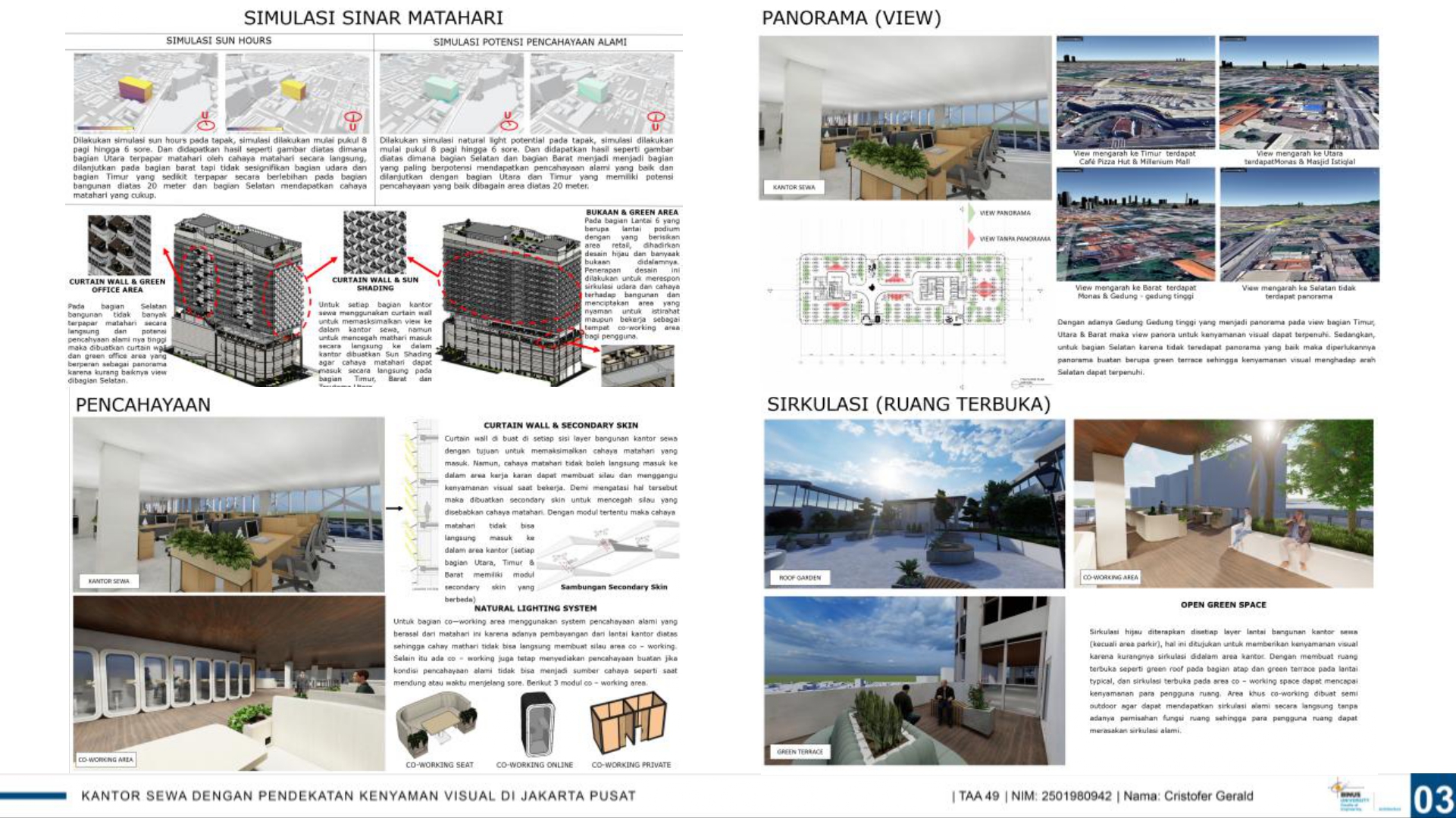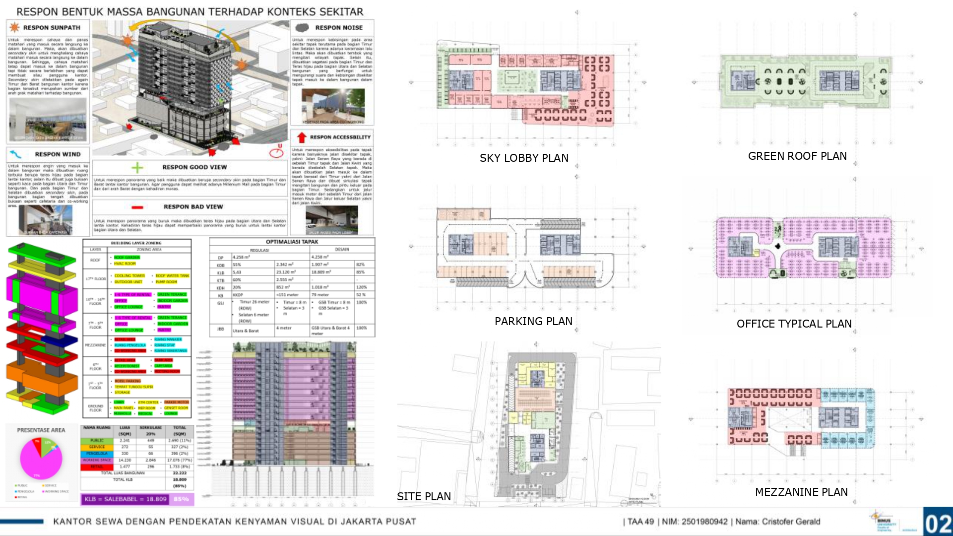DescriptionBangunan kantor sewa di Jakarta Pusat dirancang untuk menjawab kebutuhan ruang kerja modern yang tidak hanya fungsional tetapi juga memberikan kenyamanan visual bagi penggunanya. Dalam lingkungan urban yang padat dan dinamis, aspek kenyamanan visual menjadi penting untuk meningkatkan produktivitas, kesehatan mental, dan kepuasan pengguna ruang. Pendekatan desain yang digunakan mencakup pengolahan pencahayaan alami, penggunaan material dan warna yang menenangkan, serta integrasi elemen alam seperti taman vertikal dan ruang terbuka hijau. Dengan mempertimbangkan konteks iklim tropis dan karakter kota Jakarta, rancangan ini mengutamakan keseimbangan antara estetika, efisiensi energi, dan kenyamanan pengguna. Hasil desain diharapkan dapat menciptakan lingkungan kerja yang inspiratif, sehat, dan berkelanjutan bagi para penyewa kantor di pusat kota.