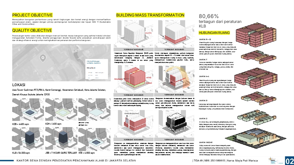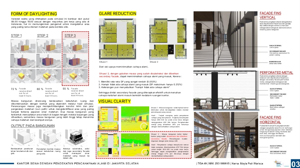 DescriptionPerancangan kantor sewa di kawasan urban padat seperti Jakarta Selatan perlu memperhatikan kenyamanan pengguna, efisiensi energi, serta respon terhadap konteks lingkungan sekitar. Pendekatan pencahayaan alami menjadi salah satu strategi utama dalam meningkatkan kualitas ruang kerja dan menciptakan suasana produktif. Penelitian ini merumuskan strategi desain pencahayaan alami melalui pengolahan massa bangunan, orientasi, konfigurasi bukaan, serta elemen fasad seperti secondary skin yang sesuai dengan iklim tropis lembap. Metode yang digunakan meliputi studi literatur, analisis iklim, studi kasus, dan simulasi digital menggunakan perangkat lunak pencahayaan. Hasil perancangan menunjukkan bahwa pencahayaan alami yang dirancang secara tepat dapat mengurangi konsumsi energi buatan, meningkatkan kenyamanan visual, dan mendukung prinsip desain pasif. Penelitian ini diharapkan memberi kontribusi terhadap desain kantor yang efisien, kontekstual, dan berkelanjutan.