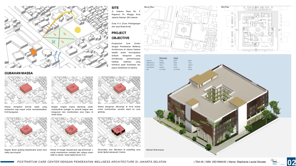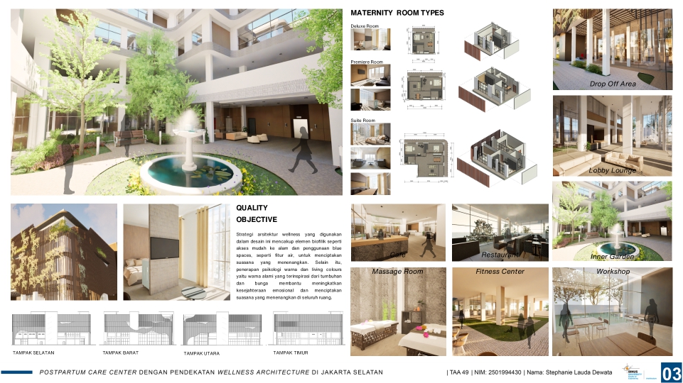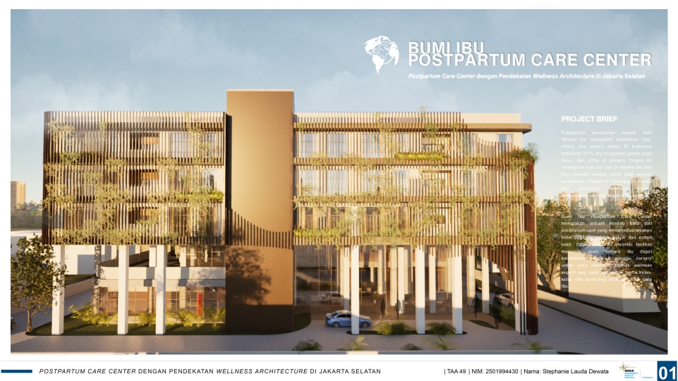 DescriptionAngka baby blues di Indonesia mencapai 57% di Indonesia yang merupakan tertinggi di Asia dan mencapai agnak 64.9% di Jakarta. Hal ini menggambarkan urgensi fasilitas pendukung pemulihan fisik serta mental ibu pasca persalinan di Indonesia. Postpartum Care Center merupakan sebuah fasilitas non-medis yang memberikan dukungan emosional. Fasilitas ini memberikan juga edukasi bagi para ibu serta bayi setelah persalinan. Arsitektur wellness menempatkan desain biofilik, pencahayaan alami, dan penggunaan psikologi warna yang dapat menciptakan ruangan sehat serta nyaman. Dengan menyediakan fasilitas yang mempunyai tujuan untuk meningkatkan perawatan pasca melahirkan serta standar layanan kesehatan di Indonesia, pusat ini mendukung target SDGs 11.3 terkait urbanisasi inklusif.