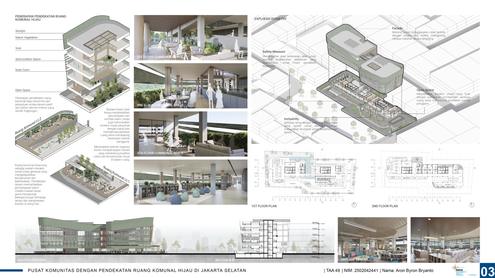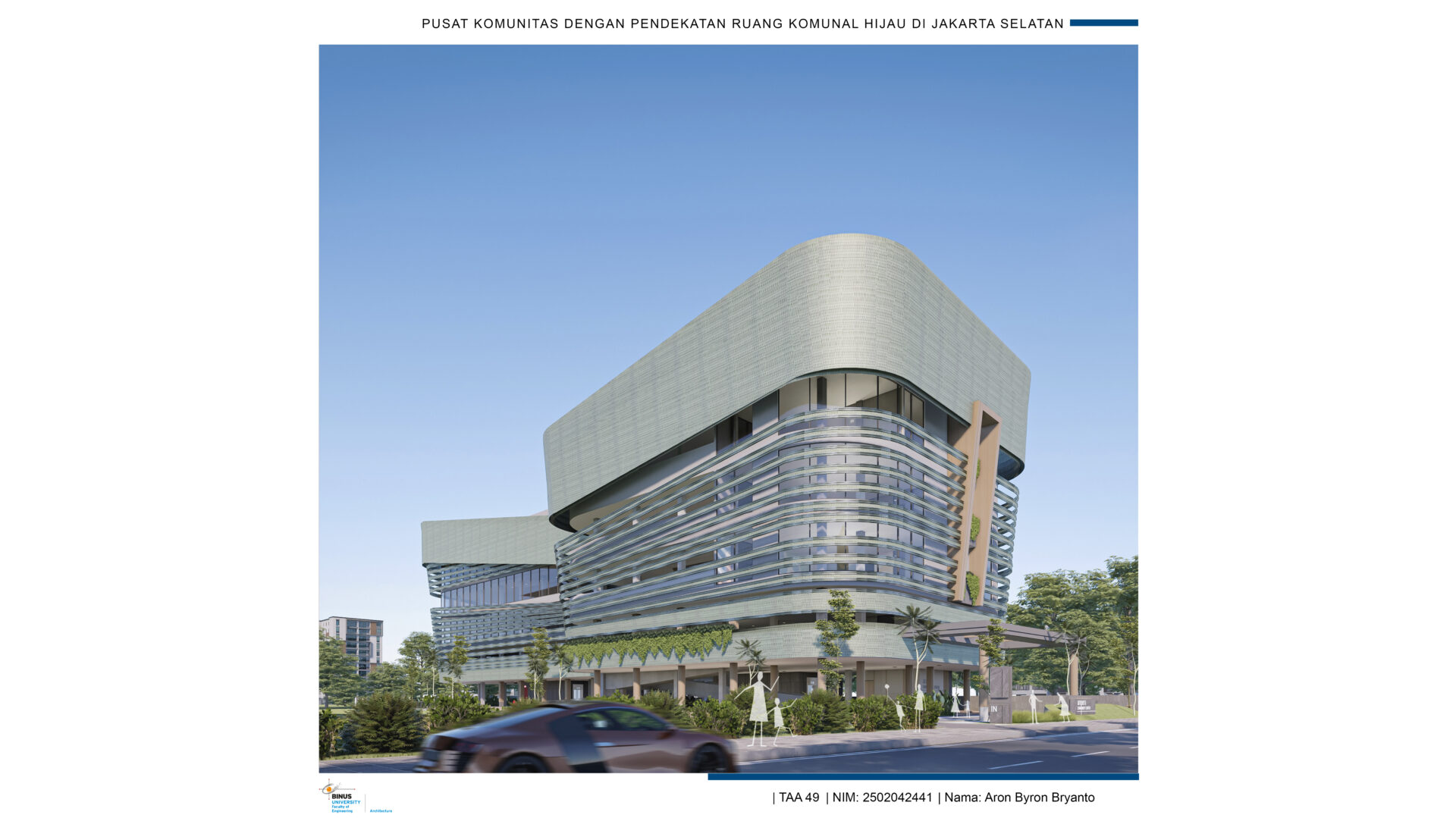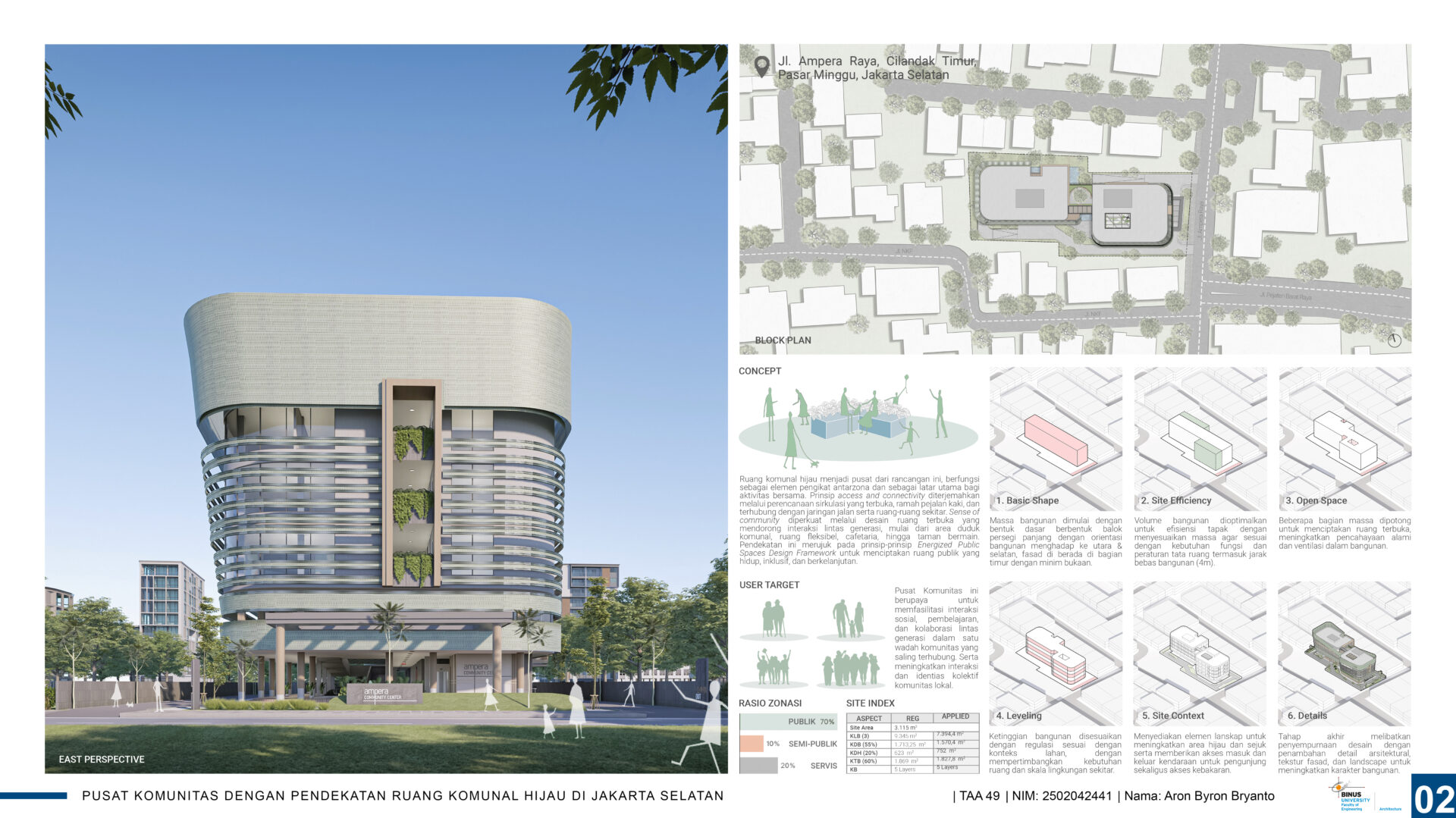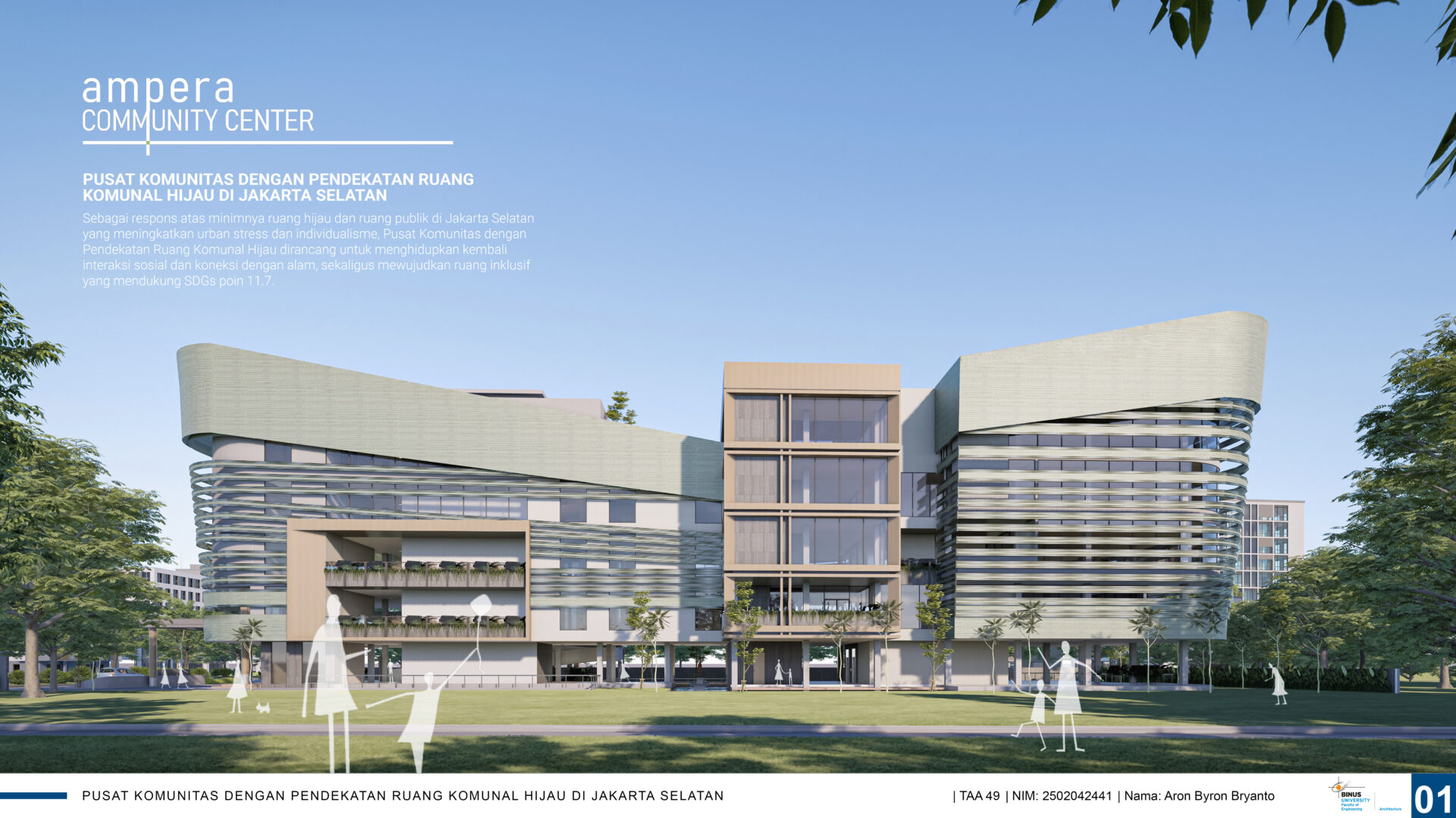 DescriptionJakarta Selatan, sebagai salah satu wilayah dengan kepadatan penduduk yang sangat tinggi, menghadapi berbagai tantangan akibat urbanisasi yang pesat, termasuk keterbatasan ruang terbuka dan minimnya fasilitas publik yang memadai. Hal ini berdampak pada menurunnya intensitas interaksi sosial antarwarga serta kualitas hidup masyarakat secara keseluruhan. Oleh karena itu, proyek “Pusat Komunitas Dengan Pendekatan Ruang Komunal Hijau di Jakarta Selatan” dirancang untuk menyediakan wadah aktivitas sosial, edukasi, budaya, dan rekreasi bagi berbagai kalangan usia. Dengan mengintegrasikan elemen taman, ruang terbuka, serta vegetasi. Proyek ini bertujuan menciptakan lingkungan yang sehat, nyaman, dan inklusif. Berlokasi strategis di Jl. Ampera Raya, pusat komunitas ini diharapkan dapat memperkuat keterlibatan sosial warga, meningkatkan kesejahteraan, serta menjadi ruang kolaboratif untuk berkreasi, berinteraksi, dan berbagi nilai-nilai kebersamaan.