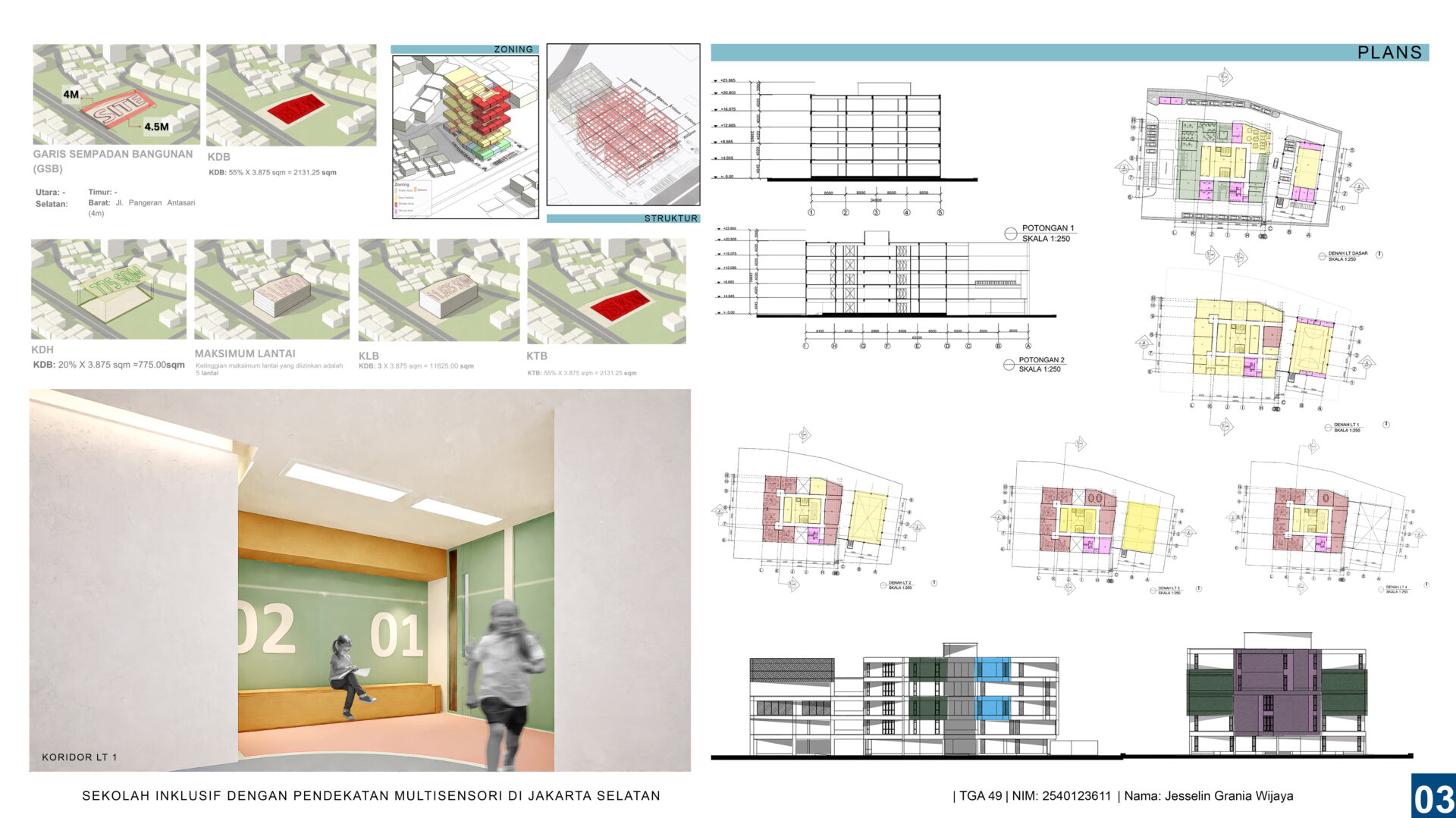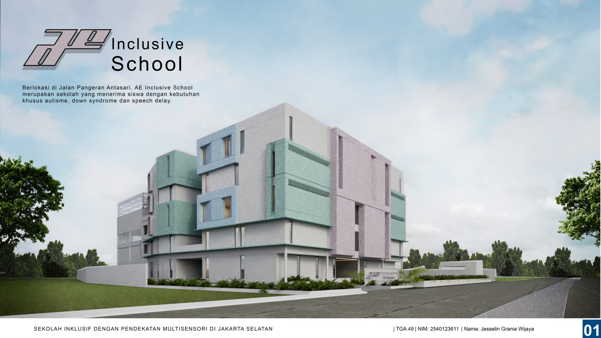 DescriptionSekolah Inklusif dengan pendekatan multisensori ini dirancang untuk menjawab kebutuhan pendidikan yang setara bagi siswa reguler maupun berkebutuhan khusus, seperti autisme, down syndrome, dan speech delay. Pendekatan multisensori digunakan untuk mendukung berbagai gaya belajar serta menciptakan pengalaman ruang yang peka terhadap kebutuhan siswa. Berlokasi di Jl. Pangeran Antasari, Jakarta Selatan, proyek ini hadir sebagai respons terhadap kebutuhan fasilitas pendidikan inklusif bertaraf internasional, dengan fokus pada tata ruang dan fasilitas yang mendukung stimulasi sensorik yang seimbang